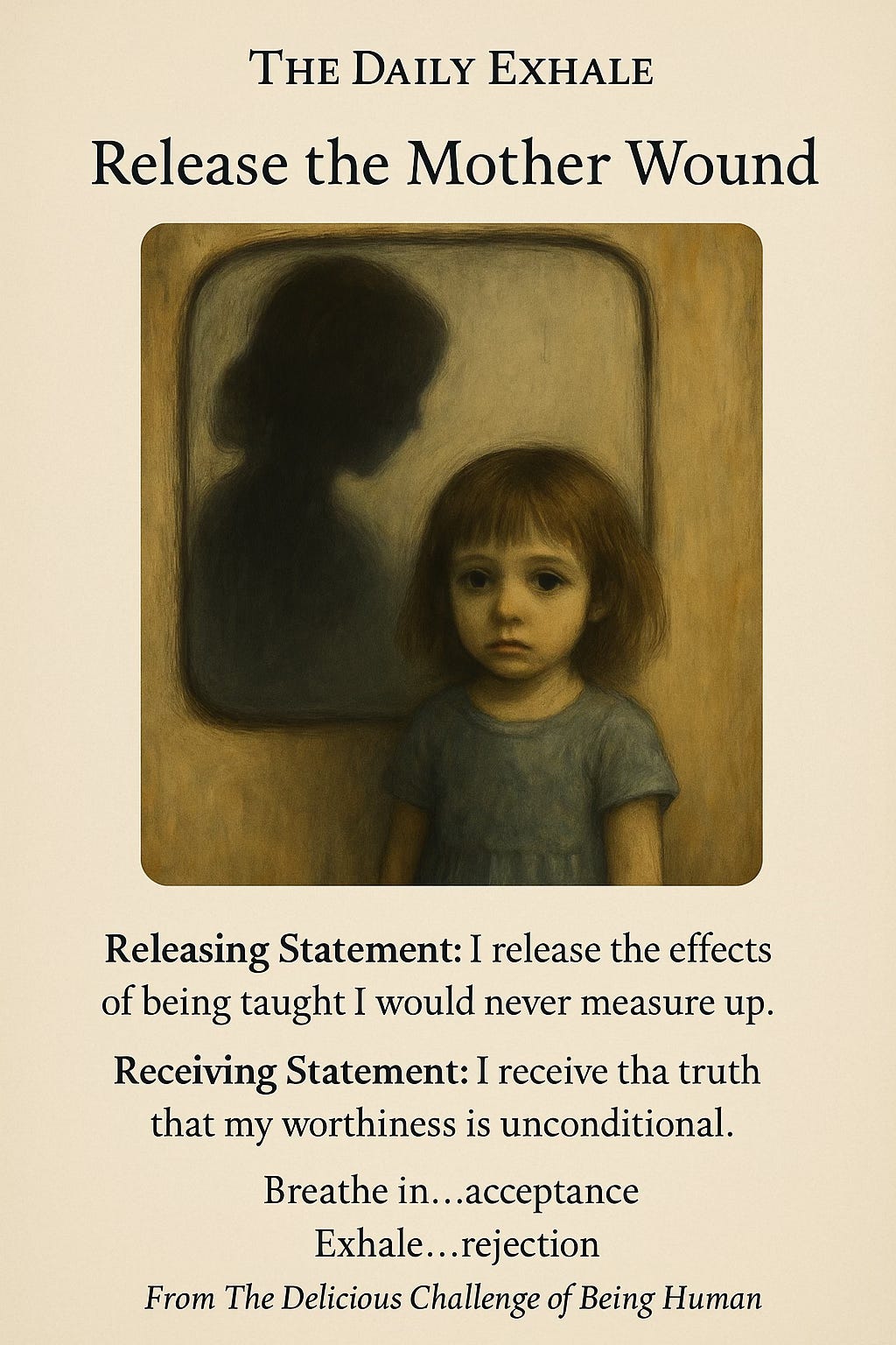 The card for this week is Release the Mother wound. Before you start reading…take a moment to take in the image. This card invites you to soften the inherited stories and internalized messages from early maternal dynamics. For the next 7 days, use this card as a way to check in and explore your relationship to these internalized messages and how you remain impacted by them in your present life.